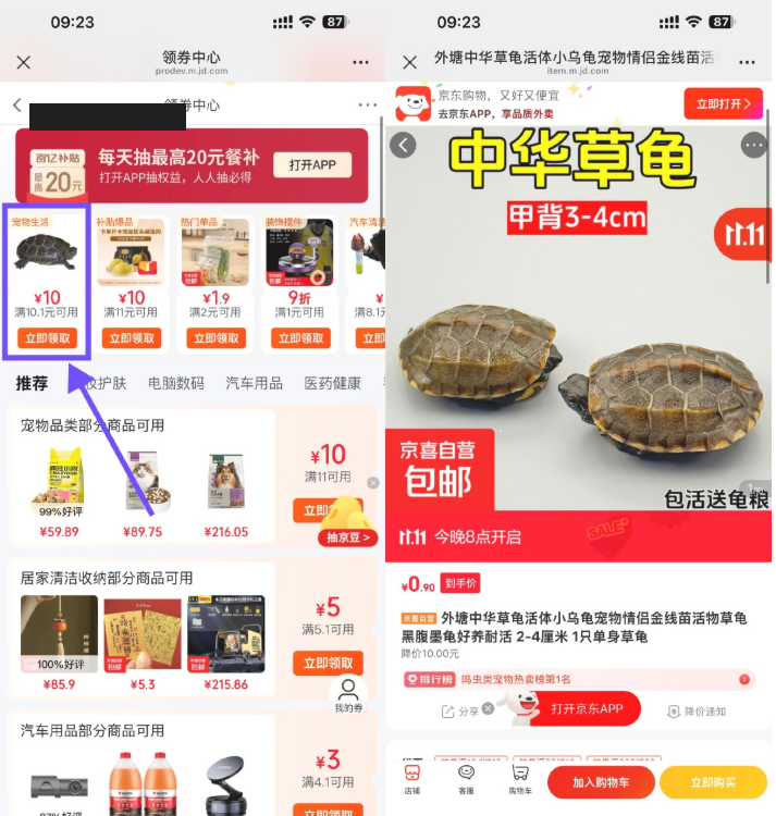 京东打开活动->右划领10亓宠物券,直接0.9亓拍下小乌龟即可