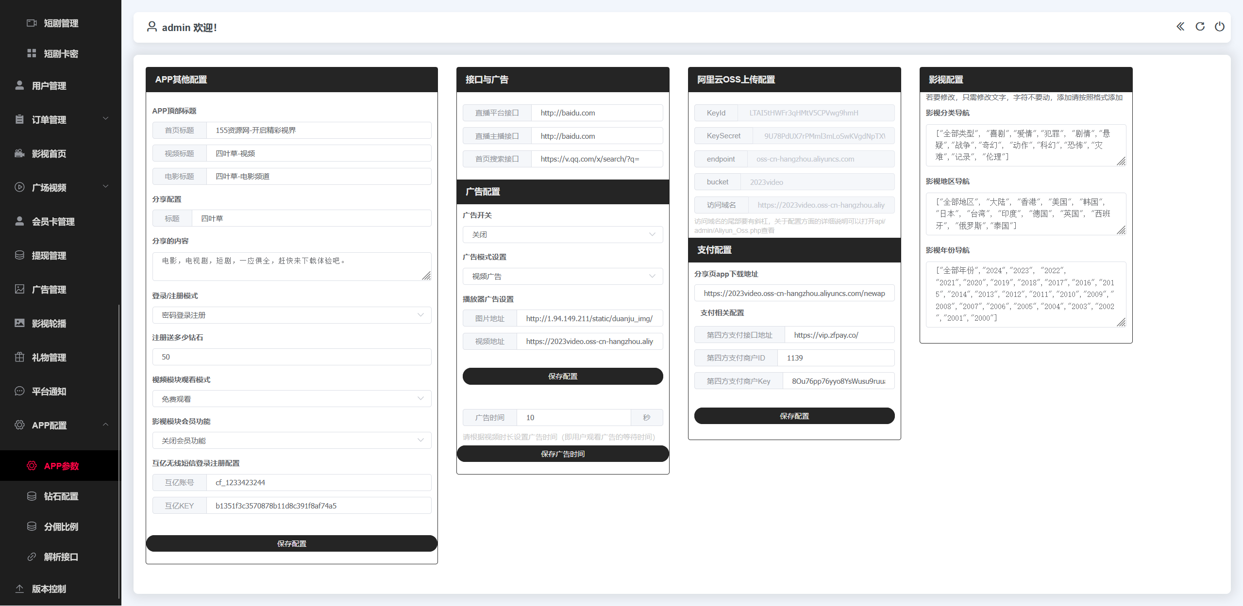 重要提示:修改后台的任何HTML、JS文件后一定要清理浏览器缓存,否则可能不生效。关于苹果CMS系统,这个只是用来采集电影电视剧用的,还使用了苹果cms自带的卡密功,用来激活app会员或者充值钻石,或者你也可以自己做一个卡密系统,还使用了苹果cms的影视分类功能,苹果cms已与app对接了,所以如非必要或者不懂,请不要改动苹果cms的任何设置,尤其是苹果cms的电影分类,切记不要去删除重新添加,请在原基础上修改即可,改动造成的错误自己解决。(做任何改动请先备份,这是良好的习惯)
